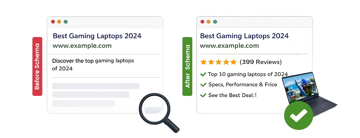 Compare a standard search listing with one powered by schema. Rich results display more details, build trust instantly, and help increase click-through rates.