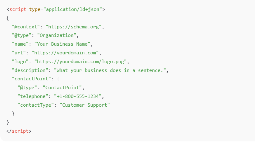 This snippet tells search engines details about your organization, fully aligned with schema.org standards.